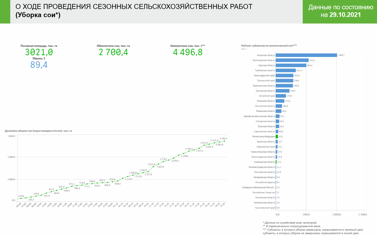 По состоянию на 29.10.2021 зерновые и зернобобовые обмолочены с площади 44,3 млн га, намолочено 120,0 млн т. В частности, пшеница обмолочена с площади 27,8 млн га, намолочено 77,9 млн т зерна. Ячмень обмолочен с площади 7,8 млн га, намолочено 18,7 млн т. Кукуруза на зерно обмолочена с площади 2,0 млн га, намолочено 10,9 млн т. Гречиха обмолочена с площади 906,9 тыс. га, намолочено 938,9 тыс. т. Рис обмолочен с площади 162,9 тыс. га, намолочено 1,1 млн т.