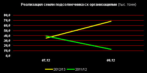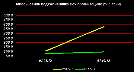 Запасы семян подсолнечника в сельхозорганизациях на 01 сентября 2012г. насчитывали 376,9 тыс. тонн, что почти в 3 раза больше, чем на 01 сентября 2011г.