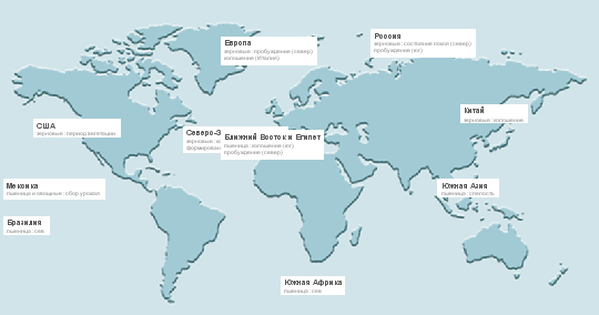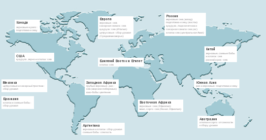 Мировой агрокалендарь на апрель, урожай яровых и озимых: зерновые, сахарная свекла, кукуруза, цитрусовые, хлопок, соевые бобы, грубые зерновые, какао-бобы, ранний, маис, рис, пшеница, сахарный тростник, рапс, сорго, овощные, зерно