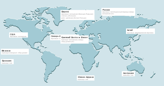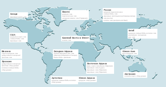Мировой агрокалендарь на май, урожай яровых и озимых: кукуруза, подсолнечник, сахарная свекла, соевые бобы, зерновые, хлопок, сорго, тростник, грубые зерновые, какао-бобы, ранний рис, рис, маис, рапс, пшеница, овощные
