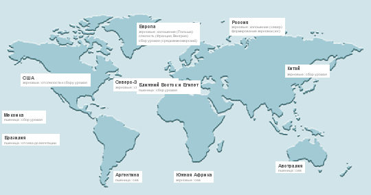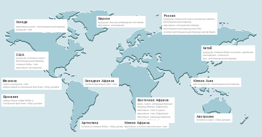 Мировой агрокалендарь на июнь, урожай яровых и озимых: кукуруза, зерновые, соевые бобы, сорго, цитрусовые, хлопок, сахарный тростник, грубые зерновые, ранний рис, рис, пшеница, маис, рапс, масличные, сахарная свекла, подсолнечник