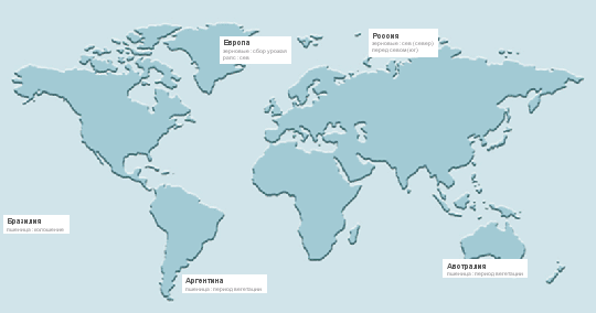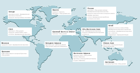 Мировой агрокалендарь на август, урожай яровых и озимых: кукуруза, зерновые, хлопок, кофе, масличные, сахарный тростник, ранний рис, рис, поздний рис, рапс, пшеница, сорго, сахарная свекла, соевые бобы, цитрусовые, подсолнечник