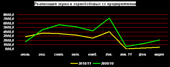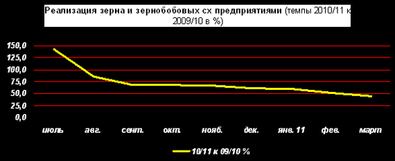 В марте 2011г. сельхозпредприятия РФ реализовали, по данным Росстата, 1336,61 тыс. тонн зерновых и зернобобовых. Это на 55,4% меньше, чем в феврале прошлого года.