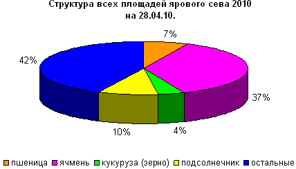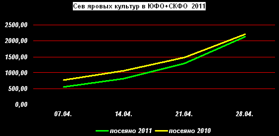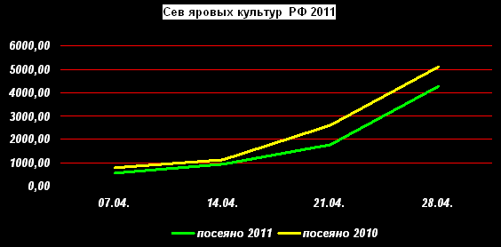 По данным МСХ РФ на 28 апреля 2011г. яровые культуры были посеяны на площади 4272,7 тыс. га, что на 16,4% меньше, чем в прошлом году (неделю назад отставание составляло 31,4%).