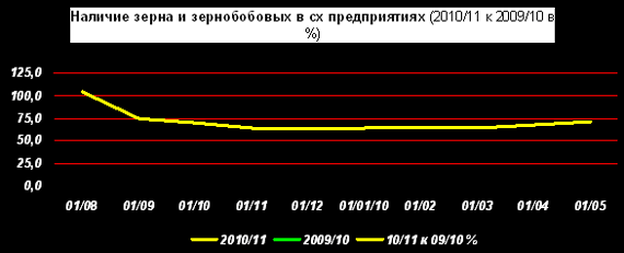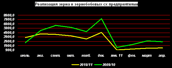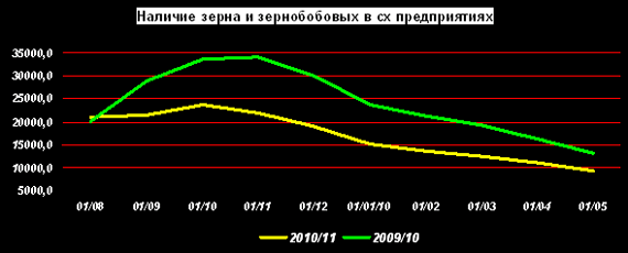 На 01 мая 2011г. в запасах у аграриев насчитывалось 9271,48 тыс. тонн зерновых и зернобобовых, что на 29,1% меньше, чем было в прошлом сезоне на аналогичную дату. Темпы сокращения запасов в апреле составили 16% (20% в прошлом году).