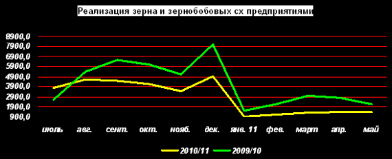 В мае 2011г. сезонного спада реализации сельхозорганизациями зерновых и зернобобовых культур не произошло. Если в прошлом годе «апрель-май» ознаменовался снижением объемов реализации на 22%, то в этом году мы имеем пусть небольшой, но плюс 0,7%. Всего же, по данным Росстата, за май 2011гг. было реализовано 1402,1 тыс. тонн зерновых и зернобобовых. Это на 35,9% меньше, чем в мае 2010г.