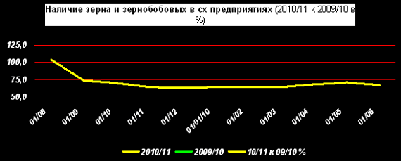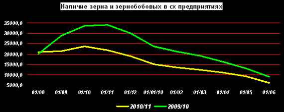 На 01 июня 2011г. в запасах у аграриев насчитывалось 6071 тыс. тонн зерновых и зернобобовых, что на 33,1% меньше, чем было в прошлом сезоне на аналогичную дату. Темпы сокращения запасов в мае 2011г. составили 34,5% (30,6% в прошлом году).