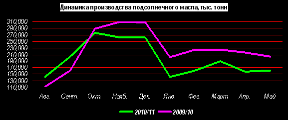 Производство подсолнечного нерафинированного масла в России в мае, по данным Росстата, составило 161,797 тыс. тонн. Это на 4,3% выше апрельского показателя, но на 20,7% ниже объёмов производства в мае 2010 года.