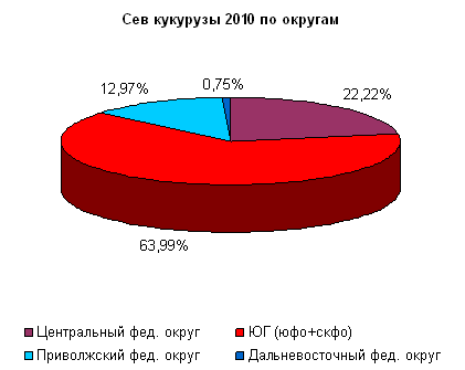 По заключительным данным МСХ РФ на 21 июня 2011г., кукуруза на зерно был посеяна на площади 1639,8 тыс. га, что на 6,4% больше, чем в прошлом году. План сева при этом выполнен на 87,1%.