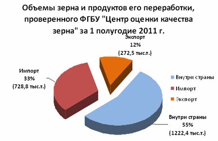 За 1 полугодие 2011 года специалистами ФГУ «Центр оценки качества зерна» проверено 2223,7 тыс.т. зерна и продуктов его переработки, в т.ч. для внутреннего рынка – 1222,4 тыс.т., при отгрузках на экспорт – 728,8 тыс.т., при поступлении по импорту – 272,5 тыс.т.