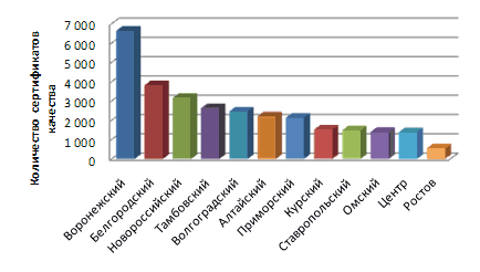 Наибольшее количество выданных сертификатов качества приходится на Воронежский (6652 шт.), Белгородский (3828 шт.), Новороссийский (3166 шт.) и Тамбовский филиалы (2636 шт.).
