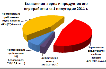 Выявлено всего 151,8 тыс.т. зерна и продуктов его переработки (6,8% от проверенного), не отвечающих требованиям нормативных документов по качеству и безопасности, в т.ч. 70,2 тыс. т. - зараженных вредителями хлебных запасов, 3,8 тыс.т. – дефектных по запаху, 10,4 тыс.т. - с превышением максимально допустимых уровней и норм по показателям безопасности, а также 67,4 тыс.т. - не соответствующих нормам по показателям качества.