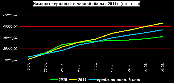 На 08 сентября 2011г. в России было намолочено 71019,2 тыс. тонн зерновых и зернобобовых культур, что на 51,% больше, чем на аналогичную дату прошлого года. И на 5% больше, чем в 2009г.