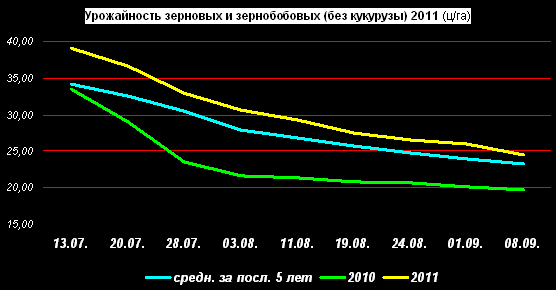 Подробные (по областям РФ) данные уборки урожая зерновых и зернобобовых культур на 08 сентября 2011г. см. ПРЯМО СЕЙЧАС