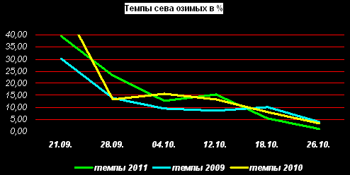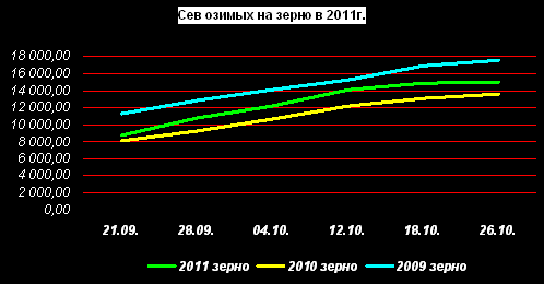 На 26 октября в России было засеяно озимыми культурами на зерно и зеленый корм 14995,5 тыс. га пахотных земель или 83,3% от плана. Это на 10,6% больше, чем на аналогичную дату прошлого года, но на 14,3% меньше, чем в 2009г.