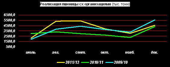 За декабрь 2011г. сельхозорганизации РФ реализовали 4562,81 тыс. тонн пшеницы. Это на 5% больше, чем за декабрь 2010г., но на 17,7% меньше, чем за декабрь 2009г.