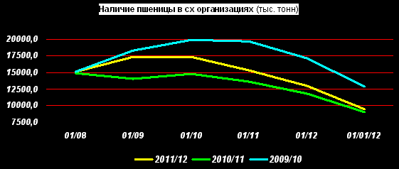 Запасы пшеницы у аграриев 4-й месяц подряд продолжают сокращаться быстрее, чем в 2010г. и в 2009г. За декабрь 2011г. их стало на 26,6%, в то время как за декабрь 2010г. на 22,8% меньше, а за декабрь 2009г. на 24,6%.
