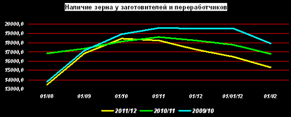 Запасы зерна у заготовителей и переработчиков также сокращаются ускоренно, к 01 февраля 2012г. их стало на 7,1% меньше, чем на 01 января 2012г. (минус 5,6% сокращение запасов в 2011г. за такой же период и минус 8,3% в 2010г.). Всего же на 01 февраля 2012г. в запасах у заготовителей и переработчиков хранилось 15326,1 тыс. тонн зерна, что на 8,7% меньше, чем на 01 февраля 2011г. и на 14,4% меньше, чем на 01 февраля 2010г.