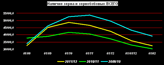 На 01 февраля 2012г. в сельскохозяйственных, заготовительных и перерабатывающих организациях РФ находилось 32346,4 тыс. тонн зерна (включая интервенционное), что на 6,3% больше, чем на 01 февраля 2011г., но уже на 17,3% меньше, чем на 01 февраля 2010г.