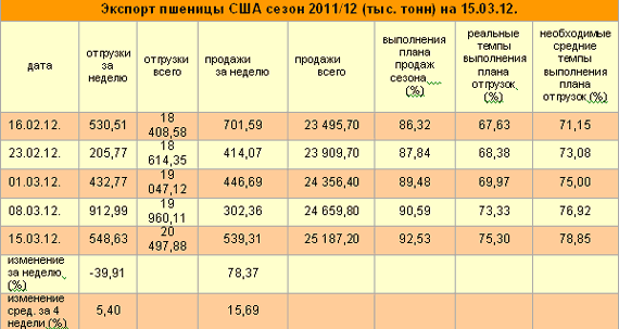 Мир проявил повышенный интерес к американской пшенице. Итоги за неделю (на 15 марта) превысили ожидания трейдеров и экспертов (они находились в диапазоне 400-500 тыс. тонн). Это способствовало достаточно серьезное снижение экспортных цен, так за период 02 – 08 марта мягкая пшеница SRW на базисе СРТ Мексиканский Залив подешевела на 15 $/тонна.