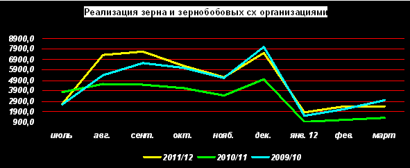 За март 2012г. сельхозорганизации РФ реализовали зерновых и зернобобовых в объеме 2433,25 тыс. тонн. Это на 82% больше, чем за март 2011г., но на 18,7% меньше, чем за март 2010г.