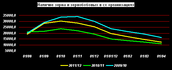Запасы зерновых и зернобобовых в сельхозорганизациях РФ на 01 апреля 2012г. насчитывали 12389,08 тыс. тонн. Это на 12,2% больше, чем на 01 апреля 2011г., но на 23,7% меньше, чем на 01 апреля 2010г.