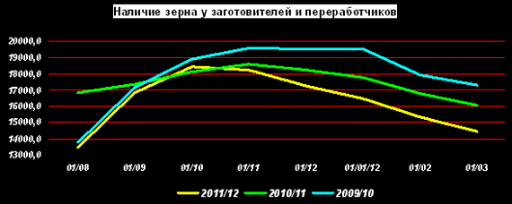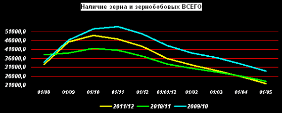 И здесь темпы сокращения запасов зерна выше, чем в прошлые сезоны. За март-апрель 2012г. их стало 11,4% меньше, тогда как в прошлом году темпы составили минус 6,2%, а в 2010г. минус 5,1%...