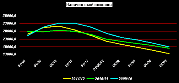 На 01 мая 2012г. в сельскохозяйственных, заготовительных и перерабатывающих организациях РФ находилось 13513,4 тыс. тонн пшеницы, что на 20,3% меньше, чем на 01 мая 2011г. и почти на 25% меньше, чем на 01 мая 2010г.