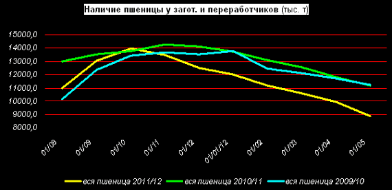 На 01 мая 2012г. в хранилищах у заготовителей и переработчиков находилось 8876 тыс. тонн пшеницы (включая интервенционную). Это на 20,7% меньше, чем на 01 мая 2011г. и на 21,1% меньше, чем на 01 мая 2010г.