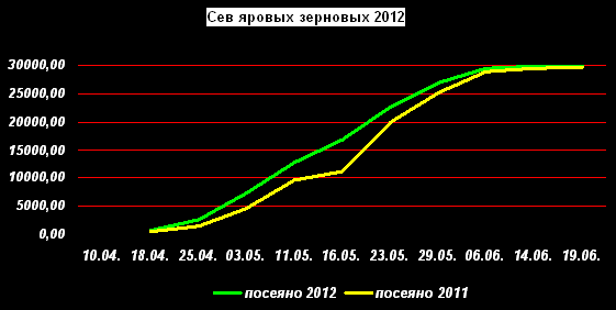 Зерновых культур посеяно на 29941,4 тыс. га, что на 1,2% больше, чем на аналогичную дату прошлого года. План сева зерновых выполнен на 98,9%. Для сравнения на аналогичную дату прошлого года выполнение составило 97,9%.
