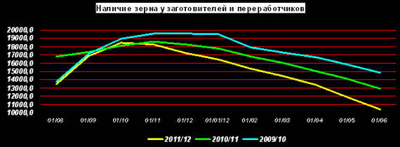 На 01 июня 2012г. в запасах у заготовителей и переработчиков хранилось 10400,00 тыс. тонн зерна, что на 19,4% меньше, чем на 01 июня 2011г. и на 30% меньше, чем на 01 июня 2010г.