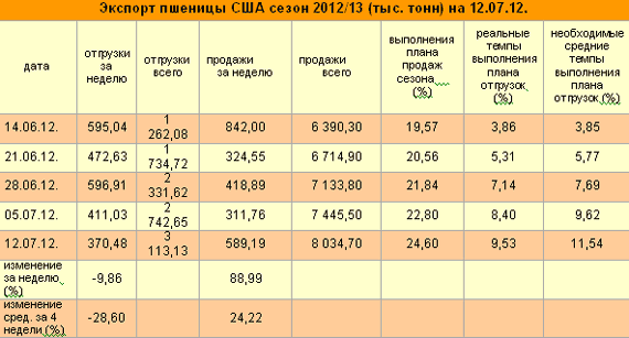 Итоги экспортной недели на 12 июля нельзя трактовать однозначно. С одной стороны, продажи американской пшеницы (589,19 тыс. тонн), несмотря на продолжающийся взлет цен, превысили показатели предыдущей недели и средние показатели за 4 недели. При этом проданный объем существенно превысил ожидания участников рынка – 350-500 тыс. тонн. На первый взгляд, может показаться, что покупатели психологически адаптировались к современному уровню цен.