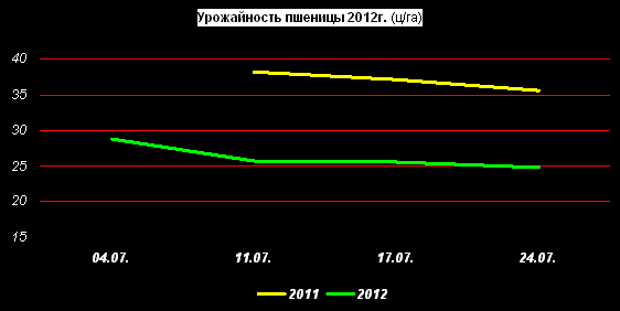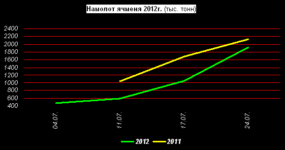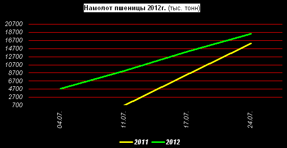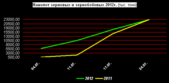 На 24 июля 2012г. в России обмолочено 9832 тыс. га зерновых и зернобобовых культур, что составляет 21,9% от всей площади к уборке. В прошлом году на аналогичную дату было обмолочено 6474 тыс. га.