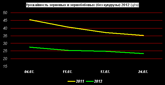 Подробные (по областям РФ) данные уборки урожая зерновых и зернобобовых культур на 24 июля 2012г. см. ПРЯМО СЕЙЧАС