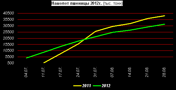 Намолот зерновых и зернобобовых на 28 августа составил 53,17 млн. тонн, что на 11,8% (или на 7,1 млн. тонн) меньше, чем на аналогичную дату прошлого года. Таким образом, отставание по объемам намолота от прошлого года, увеличивавшееся последние недели, пока прекратилось. Средняя урожайность составила 19,2 ц/га (26,3 ц/га в 2011г.).