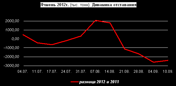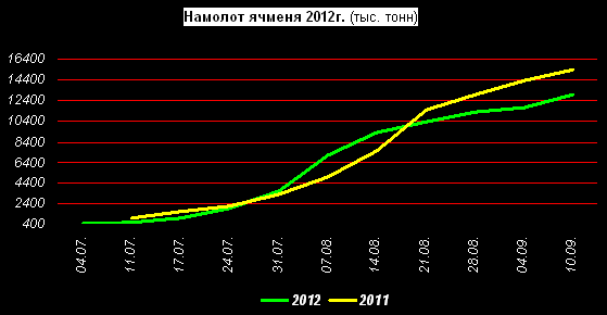 Ячменя намолочено 12,94 млн. тонн, что на 15,5% (или на 2,4 млн. тонн) меньше, чем в прошлом году при средней урожайности 18,7 ц/га (23,1 ц/га в 2011г.).