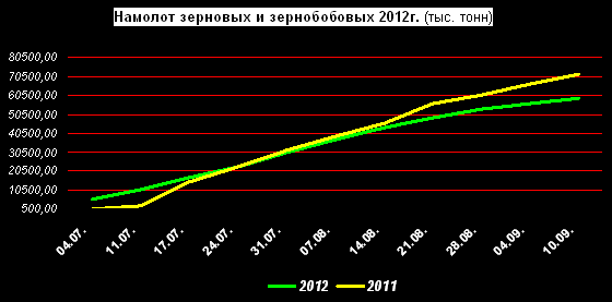 Намолот зерновых и зернобобовых на 10 сентября составил почти 58,55 млн. тонн, что на 18% (или на 12,94 млн. тонн) меньше, чем на аналогичную дату прошлого года. Средняя урожайность составила 18,5 ц/га (24,5 ц/га в 2011г.).