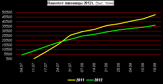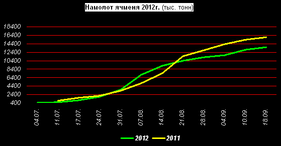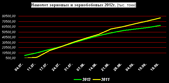 Намолот зерновых и зернобобовых на 18 сентября составил почти 62,73млн. тонн, что почти на 19% (или на 14,62 млн. тонн) меньше, чем на аналогичную дату прошлого года. Средняя урожайность составила 18,3 ц/га (23,7 ц/га в 2011г.).