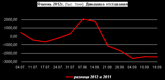 Ячменя намолочено 13,55 млн. тонн, что на 15% (или на 2,4 млн. тонн) меньше, чем в прошлом году при средней урожайности 18,6 ц/га (23 ц/га в 2011г.).