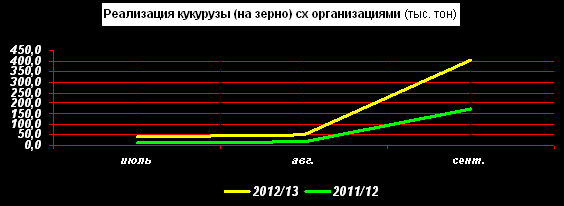 За сентябрь 2012г. сельхозорганизации РФ, по данным Росстата, реализовали 404 тыс. тонн кукурузы. Это в 2,3 раза больше, чем было реализовано в сентябре прошлого года.
