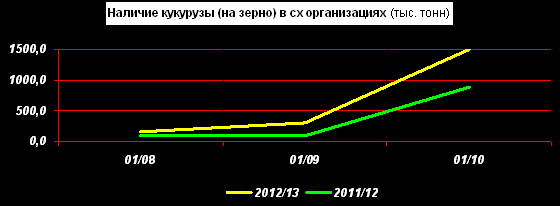 На 01 октября 2012г. в запасах у сельхозорганизаций находилось 1,49 млн. тонн кукурузы. Это на 69% больше, чем на 01 октября 2011г.
