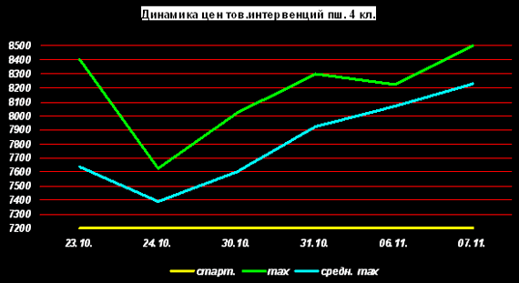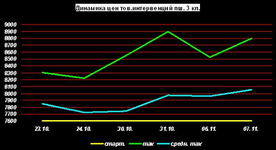 Максимальная цена, отданная за пшеницу 3 класса, выросла, хотя и не повторила рекорда нынешних торгов, установленного 31 октября и равнявшегося 8900 руб./тонна. Однако, что может быть более важно, существенно окрепла средняя максимальная цена – до 8053 руб./тонна.