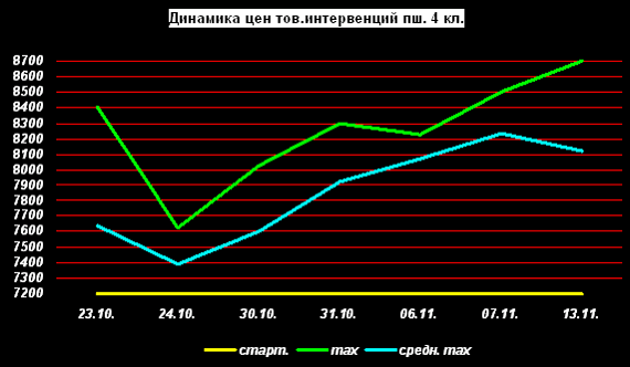 По результатам проведения торгов 13 ноября в рамках государственных зерновых интервенций в РФ объем биржевых сделок составил 63,315 тыс. тонн пшеницы на общую сумму сумму 520,2 млн. рублей.