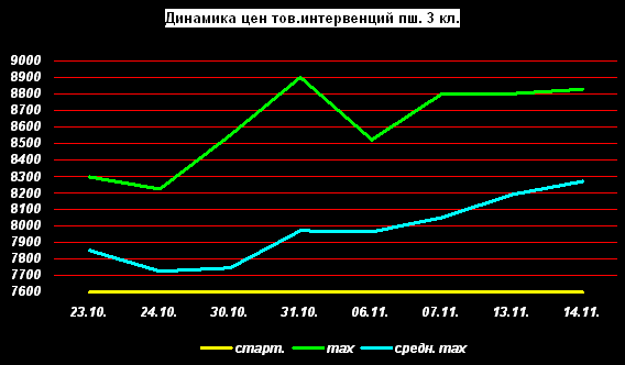 Максимальная цена за пшеницу 3 класса – 8825 руб./тонна была показана на базисе Курганской области.