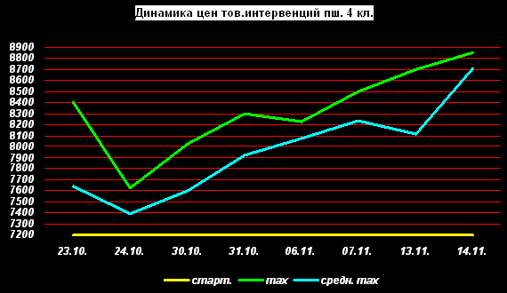 Максимальная цена за пшеницу 4 класса – 8850 руб./тонна была показана на базисе Новосибирской области.