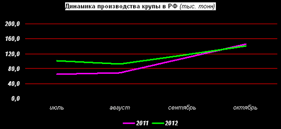 По данным Росстата, в октябре 2012г. в России было произведено 140,35 тыс. т крупы, что на 20,4% больше, чем в сентябре 2012г., но на 3,7% меньше, чем в октябре 2011г.