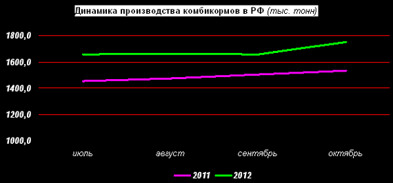 В октябре 2012г. предприятия РФ, по данным Росстата, произвели 1 751,9 тыс. т комбикормов, что на 5,8% больше, чем в сентябре и на 14% больше, чем в октябре 2011г.