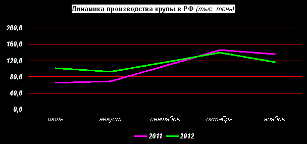 По данным Росстата, в ноябре 2012г. в России было произведено 115,8 тыс. т крупы, что на 16,7% меньше, чем в октябре 2012г., и на 14,9% меньше, чем в ноябре 2011г.