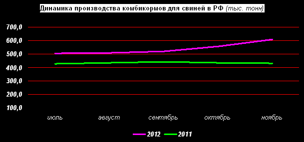 В ноябре 2012г. предприятия РФ, по данным Росстата, произвели 1 774 тыс. т комбикормов, что на 1% больше, чем в октябре и на 14% больше, чем в ноябре 2011г.