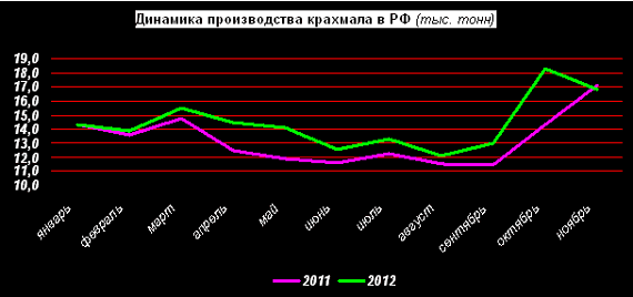 В ноябре 2012г. В России, по данным Росстата, было выпущено 16,8 тыс. т немодифицированного крахмала, что на 8% меньше, чем в октябре и на 1,5% ниже прошлогоднего показателя. Впервые за последние девять месяцев показатель месячного объема производства крахмала опустился ниже прошлогоднего уровня.